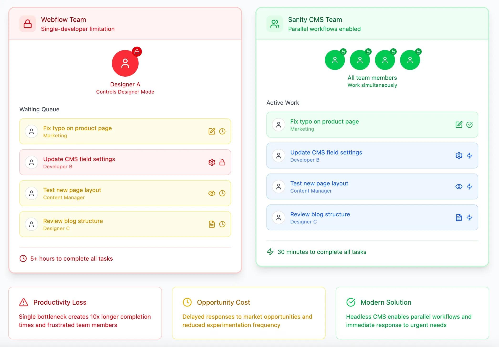 Headless CMS solutions like Sanity provide the flexibility and power of traditional CMSs while enabling true parallel development workflows. Multiple team members can work simultaneously, emergency fixes can be implemented immediately by any qualified team member, and your website becomes an asset that accelerates rather than constrains business growth.