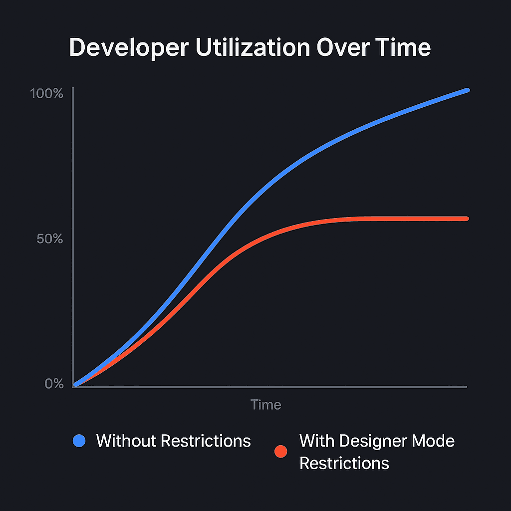 During critical launch periods at Ramp, I observed developers who could solve complex backend integration challenges being unable to fix a simple CSS spacing issue because they couldn't access Designer mode. This misalignment of skills and accessibility creates significant opportunity costs.